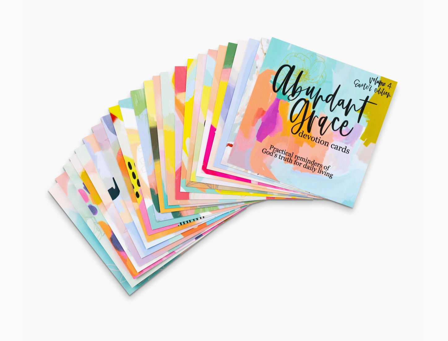 This set of devotion cards includes 31 cards. There are 30 bright and beautiful hand lettered quotes or verses on the front and short devotions on the back of each one. These cards are 4x4 inches and are professionally printed on premium matte paper with a velvet smooth finish.