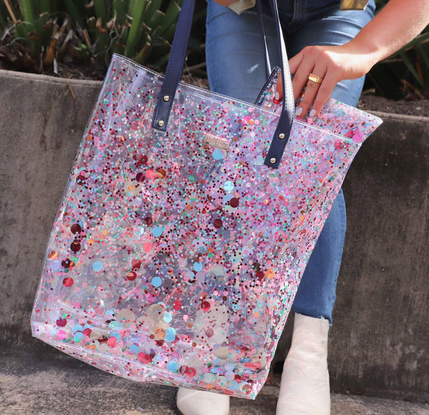 We live by the bigger the better motto so we had to step up our bucket bag game with this bigger (and even better) than ever navy version of our best-selling vinyl confetti bag! Reinforced with high-end gold hardware to hold more and with extra confetti too, this bag is sure to make a statement as you take it to work, beachside, or hey, just as an everyday work bag!