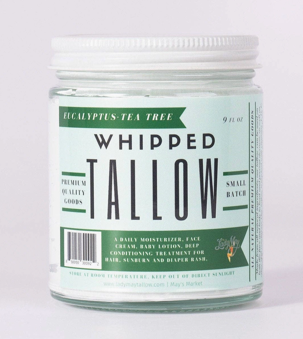 Lady May Eucalyptus Tea Tree Whipped Tallow, a luxurious, all-natural moisturizer made from grass-fed beef tallow. Whipped to a soft, airy texture, it deeply hydrates, soothes irritation, and promotes healthy skin. Infused with eucalyptus and tea tree essential oils, it provides a refreshing scent while offering natural antibacterial benefits.