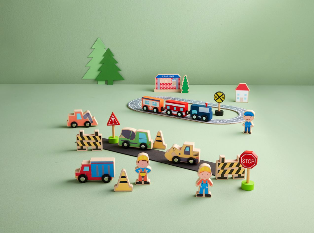 10-piece set includes three wooden train cars with magnetic connectors, train station, road sign, two trees, conductor, tree house and track. Ages 3+
