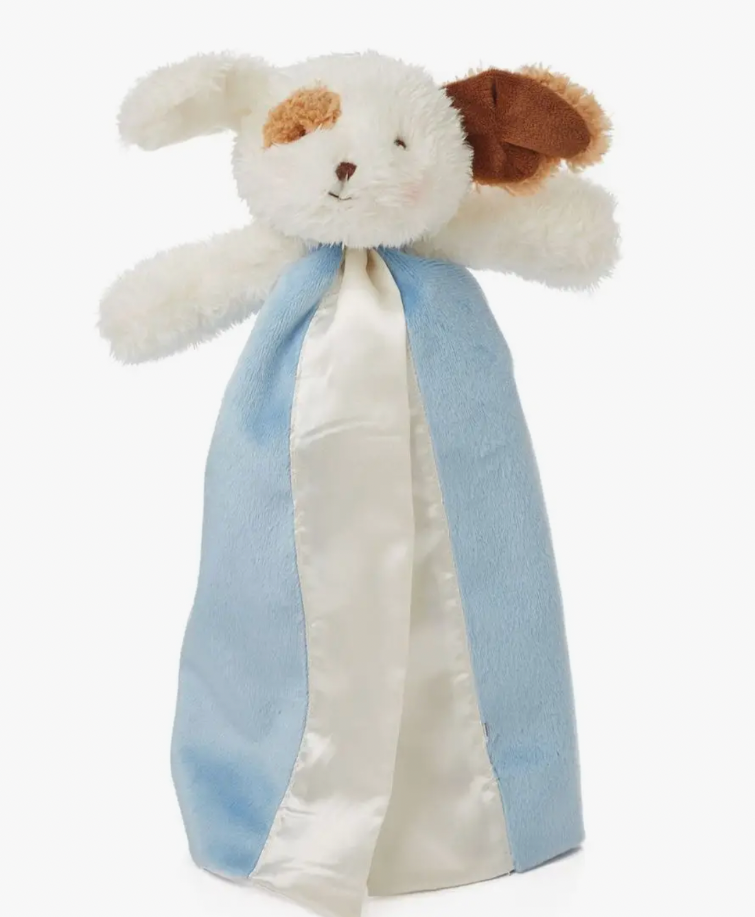 This lovey is ready to be on the go. With a handy loop on the back to attach to the car seat, stroller or crib you're sure to never be left without this precious friend again. This favorite security blanket is a plush floppy eared bunny with hand crafted, baby-safe embroidered face and a snuggly soft gray velour split blanket, lined and edged in silky white satin.
