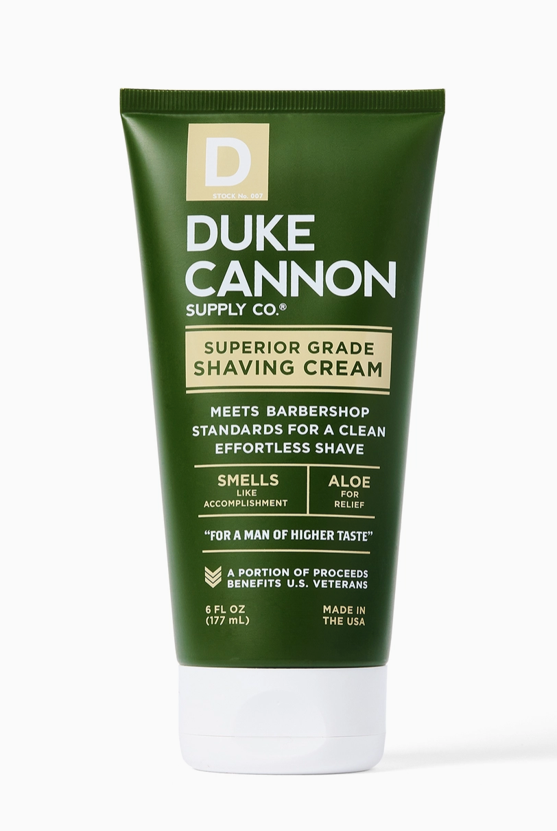 Duke Cannon's barbershop formula shaving cream is engineered with only Superior Grade ingredients: - Aloe Vera for relief. - Shea Butter for hydration. - Macadamia Nut Oil for the closest possible shave. - Calendula Extract for recovery. Scent: bergamot & pepper.